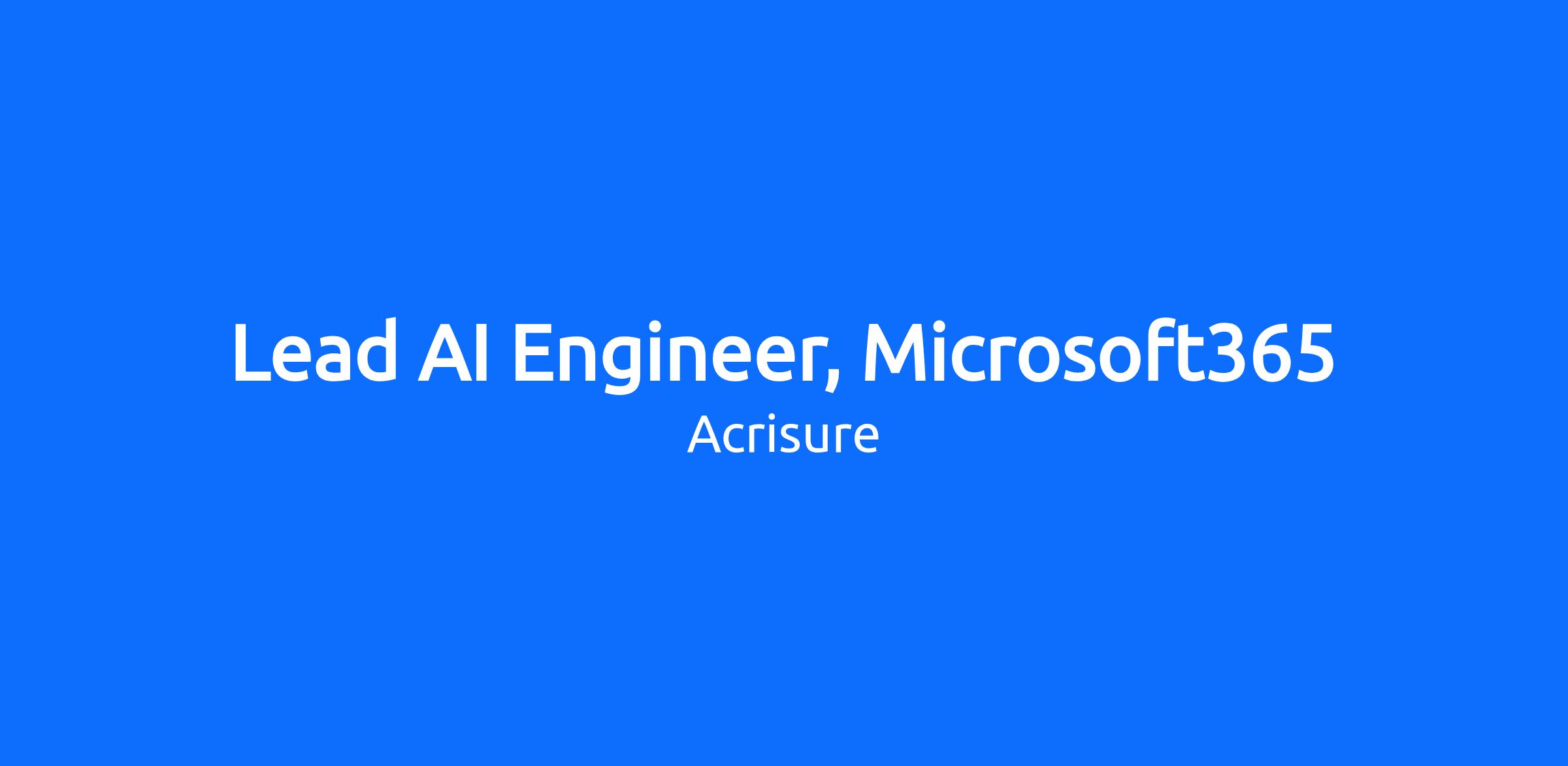 Acrisure is seeking a Lead Microsoft365 AI Engineer on our growing team. The Lead Microsoft365 AI Engineer is responsible for designing, delivering, and overseeing enterprise-grade AI solutions built on Microsoft 365, Azure AI, and Copilot Studio. This role provides technical leadership, establishes standards, and drives innovation across collaboration, productivity, and automation platforms. The engineer partners with architecture, security, and business teams to ensure scalable, secure, and high‑impact AI capabilities that modernize colleague and client experiences.